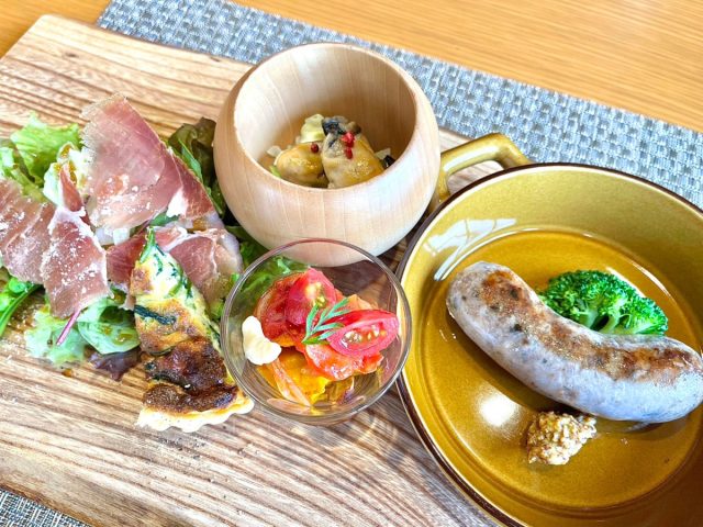 コース料理には必ず付く「けやきプレート」。ソーセージも生ハムも自家製。